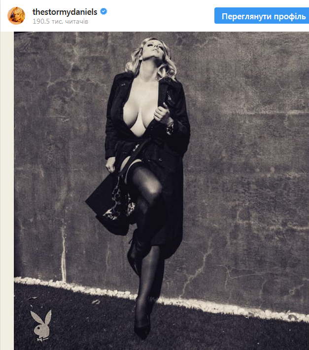 Сторми Дэниелс отметила, что она "более чем в восторге" от участия в съемках для модного журнала и назвала эту фотосессию "мечтой, которая стала явью". По словам порноактрисы, фотосессия с ее участием появится в номере Playboy, который выйдет на этой неделе. К своему сообщению она также приложила фотографию, на которой стоит у стены в черных пальто и чулках.