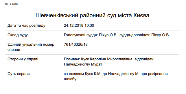 Однако в соответствии с информацией, размещенной в реестре судебных дел, назначенных к рассмотрению, иск Каролины Куек к Мурату Налчаджиоглу о расторжении брака поступил только 4 декабря. Заседание по делу назначено на 10:30 24 декабря.