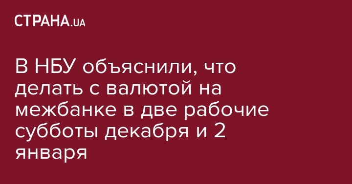 В Украине межбанковский валютный рынок не будет работать две рабочие субботы декабря - 22 и 29 числа, а также 2 января 2019 года. Об этом сообщается в телеграмме Нацбанка №40-0006/67364, оказавшейся в распоряжении UBR.ua.