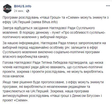 Программы "Наші Гроші" и "Схемы", которое провели десятки известных расследований (в том числе и против нынешней власти), могут исчезнуть из эфира UA:перший в связи с выборами. Об этом говорится в заявлении Bihus.info и руководителя проекта Дениса Бигуса в Facebook.