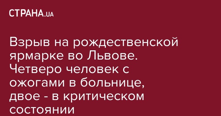 В результате взрыва газового баллона на рождественской ярмарке во Львове четыре человека были госпитализированы в больницу. Двое из них попали в реанимацию, двое находятся в ожоговом отделении. Об сообщает пресс-служба Львовского горсовета.