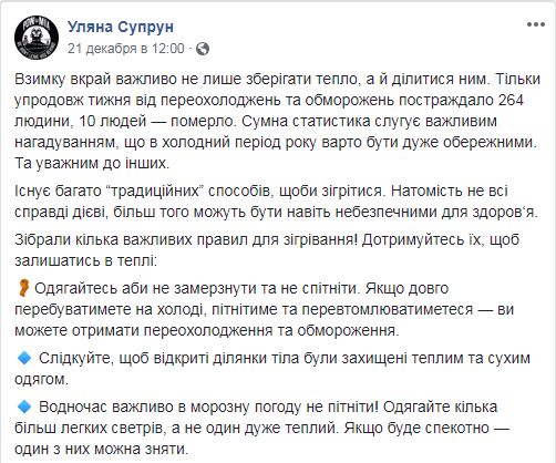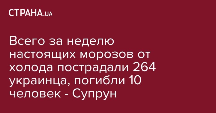 В течение прошедшей недели от переохлаждения и обморожений в Украине пострадали 264 человека, 10 украинцев погибли. Об этом и.о. министра здравоохранения Ульяна Супрун написала на своей странице в Facebook.