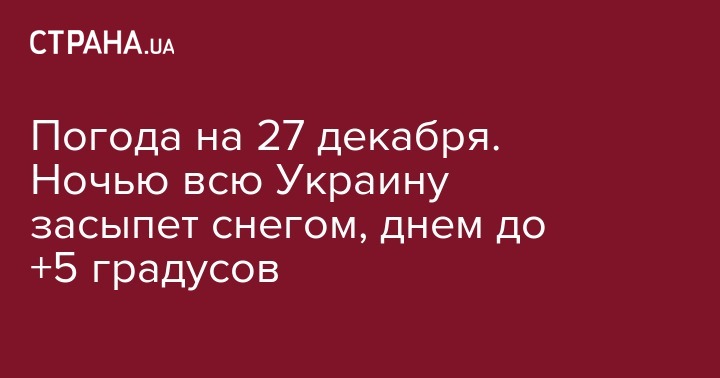 Сегодня, 27 декабря, днем снег и дождь обойдут стороной центральную, северную часть Украины и юг страны, а вот ночью снег пойдет во всех регионах. Об этом сообщает сайт Укргидрометцентра.