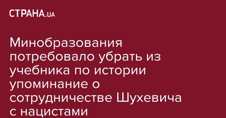 Министерство образования и науки Украины обязало издательство учебников истории Украины для 10 класса убрать упоминание о сотрудничестве Романа Шухевича и дивизии СС "Галиция" с подразделениями нацистской армии. Об этом на своей странице в Facebook сообщил директор Украинского еврейского комитета Эдуард Долинский.