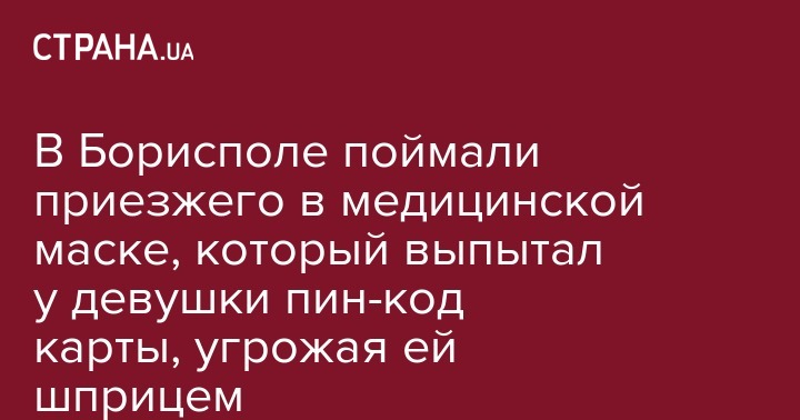 Нападение произошло на одной из улиц города Борисполь. Около 19:00 неизвестный в медицинской маске напал на 18-летнюю девушку, отобрал у нее мобильный телефон, деньги и банковские карты. Затем, угрожая шприцем с якобы смертельным веществом, узнал их пин-код.
