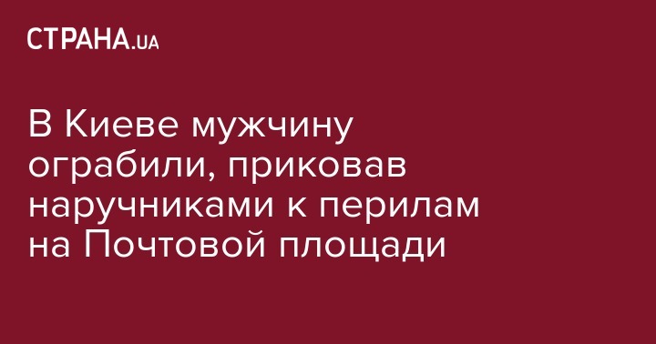 В Киеве на Почтовой площади неизвестные при помощи наручников ограбили мужчину. Двое грабителей заехали на машине на Почтовую площадь, изменили номерные знаки на автомобиле, становили прохожего и приковали его к перилам наручниками. Неизвестные начали угрожать потерпевшему, а потом забрали у него рюкзак с личными вещами и деньгами. Об этом сообщает пресс-служба Нацполиции Киева.