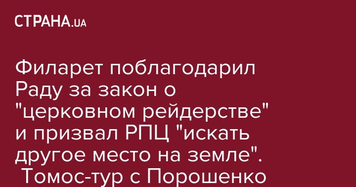 Филарет поблагодарил Раду за закон о "церковном рейдерстве" и призвал РПЦ "искать другое место на земле". Томос-тур с Порошенко доехал до Житомира
