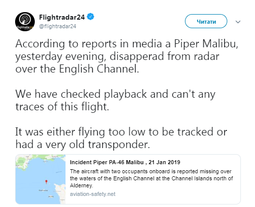 В то же время главный сервис отслеживания авиарейсов Flightradar заявил, что изучил историю перелетов за 22 января, но рейса не обнаружил. Возможно, самолет летел слишком низко для обнаружения или на нем стоял старый передатчик.