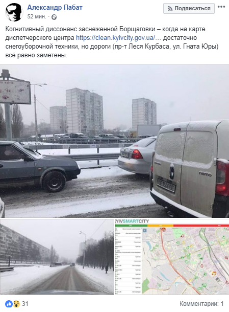 О том, что скрывается за многоточием в посте политика можно определить по публикации еще одного депутата, на этот раз Киевсовета, - Александра Пабата. Он в своем Facebook опубликовал фото заснеженной Борщаговки. Также Александр отметил такой диссонанс: на карте диспетчерского центра обозначено, что в районе достаточно снегоуборочной техники, но дороги все равно заметены.