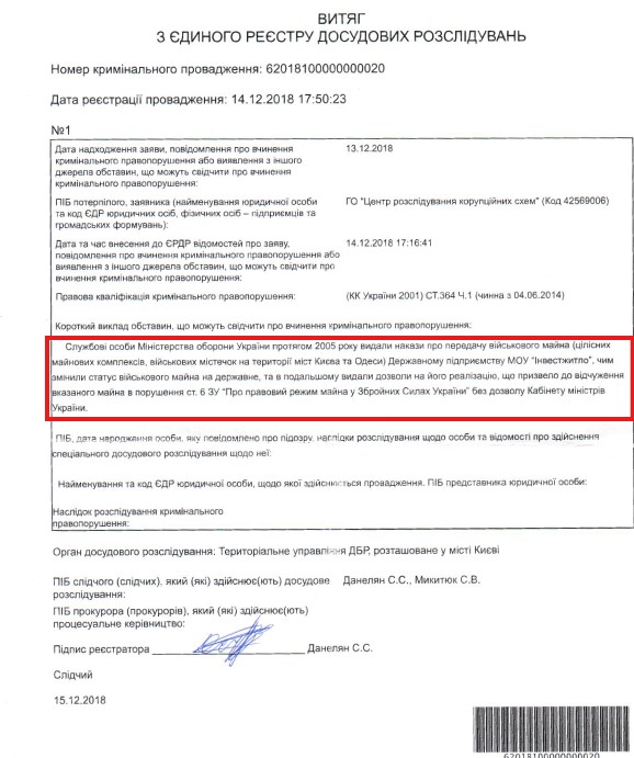 В коротком изложении обстоятельств, которые доступны в ЕРДР, говорится: "Должностные лица Министерства обороны Украины в течение 2005 года выдали приказы о передаче военного имущества (целостных имущественных комплексов, военных городков на территории городов Киева и Одессы) государственному предприятию МОУ "Инвестжитло", чем изменили статус военного имущества на государственное, и в дальнейшем выдали разрешение на его реализацию, что привело к отчуждению указанного имущества в нарушении ст. 6 Закона Украины "О правовом режиме имущества в Вооруженных Силах Украины" без разрешения Кабинета министров Украины".