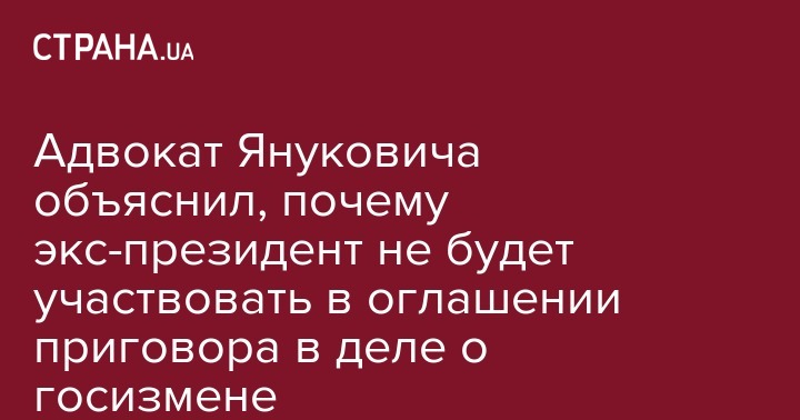 Экс-президент Украины Виктор Янукович не будет принимать участие в оглашении приговора в деле о государственной измене. Об этом сообщает УНН со ссылкой на адвоката Виталия Сердюка.