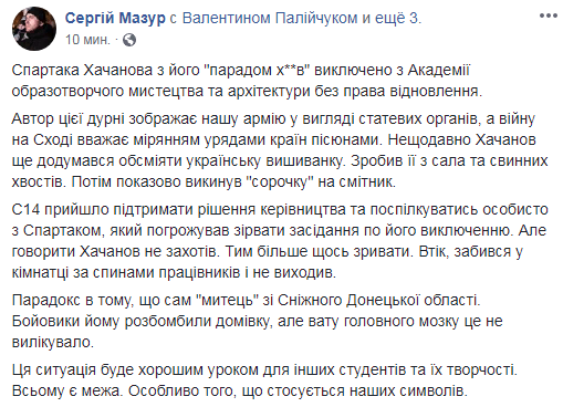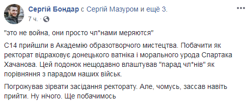 Радикал Сергей Бондарь на своей Facebook-странице опубликовал фото в подтверждение присутствия членов на экспозиции студента-искусствоведа из Донецка. Также радикал назвал студента-четверокурсника "ватником" и "моральным уродом".