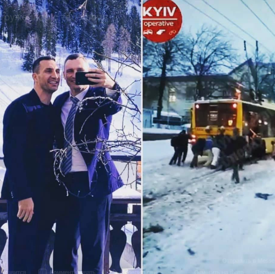 Олеся Медведева проводит аналогии между двумя фотографиями, первая - знакомое фото с братьями Кличко, а вторая - фото, где киевляне сами выталкивают застрявший в снегах троллейбус.