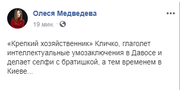 Кирилл Куликов отмечает, что Кличко поехал в Давос, чтобы участвовать в панельной дискуссии "Разумное финансирование умных городов."Тот, кто зарегистрировал Витальку на эту панель - троль", - написал она.