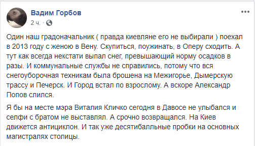 Вадим Горбов по поводу визита Кличко в Давосе вспоминает похожую ситуацию в 2013 году, когда один градоначальник поехал с женою в Вену. "Скупиться, поужинать, в Оперу сходить. А тут как всегда некстати выпал снег, превышающий норму осадков в разы. И коммунальные службы не справились, потому что вся снегоуборочная техника была брошена на Межигорье, Дымерскую трассу и Печерск. И Город встал по-взрослому. А вскоре Александр Попов слился. Я бы на месте мэра Виталия Кличко сегодня в Давосе не улыбался и селфи с братом не выставлял. А срочно возвращался. На Киев движется антициклон. И так уже десятибалльные пробки на основных магистралях столицы", - предупредил Горбов.