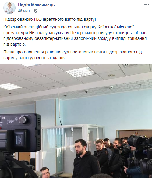 По ее словам, Киевский апелляционный суд удовлетворил жалобу прокуратуры и отменил постановление Печерского райсуда столицы о залоге, а также избрал подозреваемому безальтернативную меру пресечения в виде содержания под стражей до 2 марта 2019 года. Очертяного взяли арестовали в зале суда.
