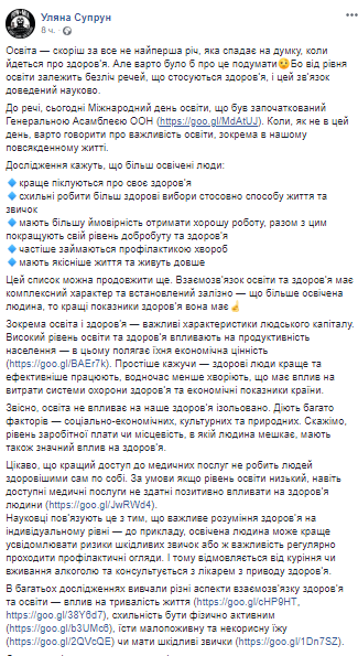 Образованные люди могут лучше позаботиться о своем организме. Об этом заявила на своей странице в Facebook глава МОЗ Ульяна Супрун.