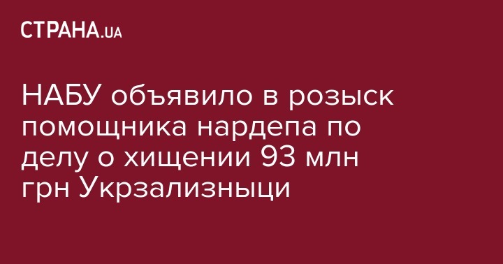 Национальное антикоррупционное бюро (НАБУ) сообщило помощнику одного из нардепов, бывшему чиновнику "Укразализныци", о подозрении в завладении 93,27 млн грн предприятия и объявило его в розыск. Об этом сообщает пресс-центр НАБУ.
