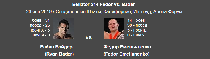 Поздно вечером 26 января в Калифорнии (в Киеве ранним утром 27 января) состоялся финал Гран-при тяжеловесов ММА Bellator 214, в котором выступают звезды второго десятка лучших бойцов ММА в мире, в отличие от промоушна UFC, собравшего звезд первой величины. На октагоне встретились Федор Емельяненко и Райан Бейдер. Бой транслировало "Матч ТВ".