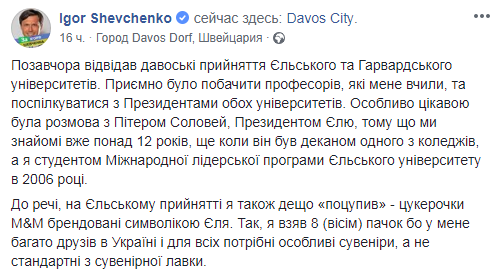 "Кстати, на Йельском приеме я также кое-что "украл" - конфетки М&М`s, брендированные символикой Йеля. Да, я взял 8 (восемь) пачек, ибо у меня много друзей в Украине, и для всех нужны особые сувениры, а не стандартные из сувенирной лавки", - похвастался Шевченко.
