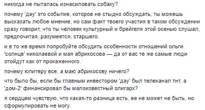 "Тарковский для кадра коров сжигал, а у режиссера "Дау" проститутку для съемок привезли и в кадре насилуют бутылкой. А потом заявляют, что она была не против... (!!!) У меня волосы на голове зашевелились от ужаса. И оправдывается отчего-то этот кошмар тем, что это "ыскуства" и "что дозволено Юпитеру, не дозволено быку", – пишут в Facebook.