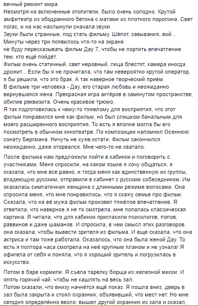"Я впервые услышала о проекте ДАУ этой осенью. Оказалось, что в Харькове долго-долго шел гигантский по своим масштабам и сложности социальный эксперимент. Шел, а Харьков не очень знал. И вот – эксперимент окончен.