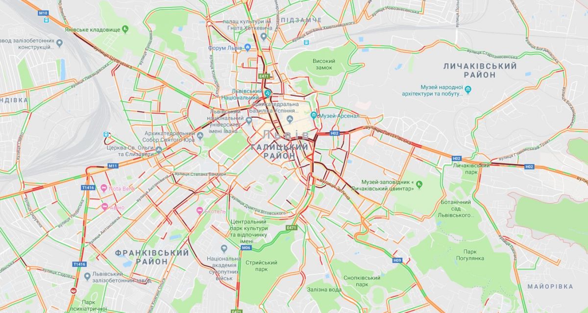 По данным сервиса "Google-карты", особенно крупные заторы образовались в Галицком районе города. Местный горсовет сообщает о 20% от месячной нормы снега, который выпал всего за одни сутки. Это - 9,1 миллиметра осадков. Прирост снега составил 4 сантиметра.