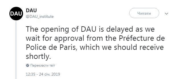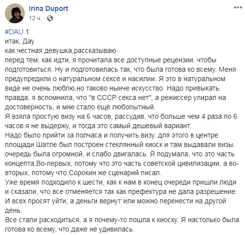 Показ 700-часового фильма "Дау" должны были запустить 24 января и уже продавали так называемые визы (билеты) на этот день и последующие. Затем он был отменен.