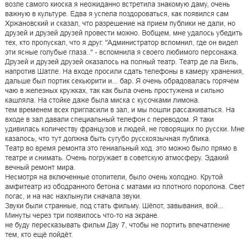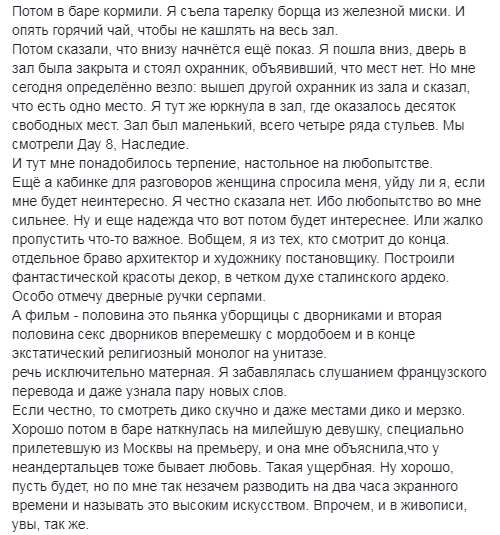 Живущая во Франции исполнительный директор Trempel FILMS Ирина Дюпорт опубликовала на своей Фейсбук-странице впечатления после просмотра.