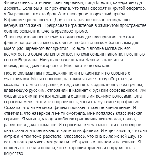 После "Дау 7" она попробовала посмотреть еще один фильм серии. И также поделилась впечатлениями в соцсети.