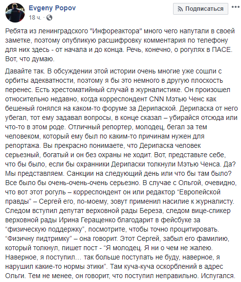 "Следом вступил депутат Верховной рады Береза, следом вице-спикер Верховной рады Ирина Геращенко благодарит в фейсбуке за "физическую поддержку", посмотрите, чтобы точно процитировать. Этот Сергей, забыл его фамилию, который толкнул, пишет пост — "Я молодец. Я ни о чем не жалею... Там куча-куча оскорблений в адрес Ольги. Тем не менее он говорит, что поступил неправильно. Испугался", - сообщил он.