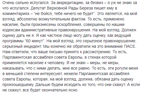 "Мы, конечно же, обратили на это внимание ПАСЕ. Нам ответили, что ваше письмо принято к рассмотрению. То есть Парламентская ассамблея Совета Европы, в стенах которой применяется насилие к человеку. Я не знаю — меры, не меры, наказывать, что с ними делать, мне все равно. То есть эти рогули меня в меньшей степени интересуют, нежели Парламентская ассамблея Совета Европы, которая, на мой взгляд, должна, обязана дать оценку произошедшему", — добавил журналист.