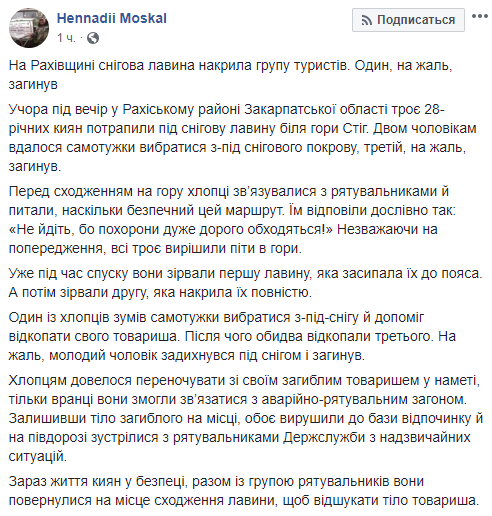 "Перед восхождением на гору ребята связывались со спасателями и спрашивали, насколько безопасен этот маршрут. Им ответили дословно так: "Не ходите, потому что похороны очень дорого обходятся". Несмотря на предупреждение, все трое решили пойти в горы. Уже во время спуска они сорвали первую лавину, которая засыпала их до пояса. А потом сорвали вторую, которая накрыла их полностью", - написал Москаль.