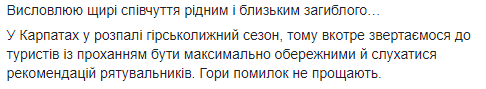 "Оставив тело погибшего на месте, оба отправились к базе отдыха и на полпути встретились со спасателями Госслужбы по чрезвычайным ситуациям. Сейчас жизнь киевлян в безопасности, вместе с группой спасателей они вернулись на место схода лавины, чтобы отыскать тело товарища",  -  рассказал глава ОГА.