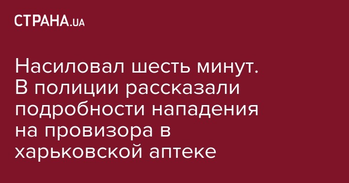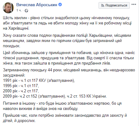 "Шесть минут - ровно столько понадобилось этому никчемному подонку, чтобы изнасиловать и чуть не убить молодую женщину на ее рабочем месте на Харьковщине.... Этот извращенец зашел в помещение и увидел, что женщина одна, нанес телесные повреждения, придушил и изнасиловал. От смерти ее спасла только женщина, которая также зашла в помещение для приобретения лекарств", - сообщил Вячеслав Аброськин.