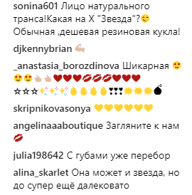 "С губами уже перебор", "Лицо натурального транса! Какая нах "Звезда"? Обычная дешевая резиновая кукла!", "Ну как? Скажите как можно после двух родов иметь такую грудь?", "Кому-то нравится, кому-то - нет, у всех свое", - писали в комментариях.