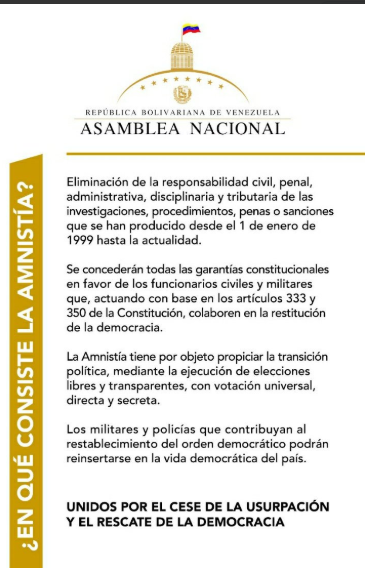 Гуайдо отметил, что данный закон должен способствовать переходу к политическому процессу с помощью демократических выборов. В тексте указывается, что соратники действующего президента Николаса Мадуро будут реабилитированы для дальнейшей демократической жизни в Венесуэле.