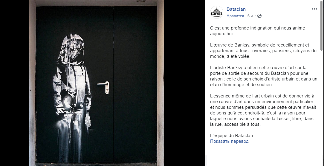 "Сегодня нами движет глубокое негодование. Работа Бэнкси, символ размышления, которая принадлежала всем: приезжим, парижанам, гражданам мира, - была похищена", - говорится в сообщении.