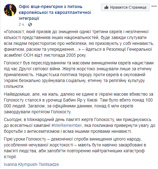 О присоединении Украины ко всемирной кампании #WeRemember заявила вице-премьер-министр по вопросам европейской и евроатлантической интеграции Иванна Климпуш-Цинцадзе. Она призвала сохранить уроки произошедшего для предотвращения катастроф в будущем.