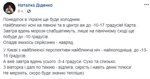 "Понедельник в Украине еще будет холодным. Ближайшей ночью на севере и в центре до -10-17 градусов! Завтра днем морозы ослабнут, только на северо-востоке еще побудет до -10 градусов. Осадков каких-либо серьезных - вряд ли", - сказано в сообщении.