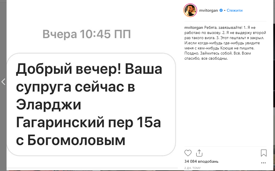 "Ребята, завязывайте! Во-первых, я не работаю по вызову. Во-вторых, я не выдержу второй раз такого визга. В-третьих, - этот гештальт я закрыл. И если когда-нибудь где-нибудь увидите меня с кем-нибудь, Ксюше не пишите. Поздно. Займитесь собой. Все. Всем спасибо, все свободны", - заявил актер", - отметил Виторган.
