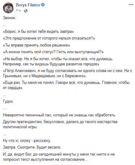Филатов цитирует разговор с Порошенко в своем Facebook: