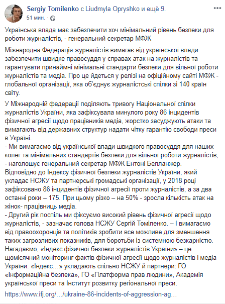 "Согласно Индексу физической безопасности журналистов Украины, который ведет НСЖУ и партнерские общественные организации, в 2018 году зафиксировано 86 инцидентов физической агрессии против журналистов, а за последние два года - 175. При этом резко - на 50% - возросло количество атак на женщин - работниц медиа", - пишет Сергей  Томиленко.