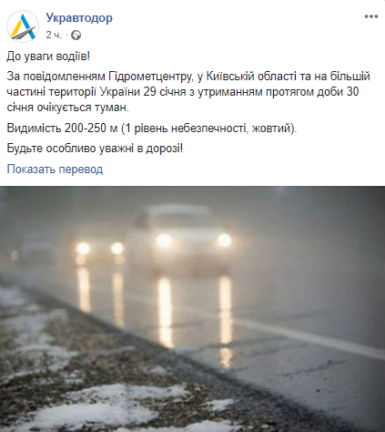 "По сообщению Гидрометцентра, в Киевской области и на большей части территории Украины 29 января с удержанием в течение суток 30 января ожидается туман. Видимость 200-250 метров (1 уровень опасности, желтый)", - говорится в сообщении. "Укравтодор" призывает водителей быть особенно внимательными на дороге.