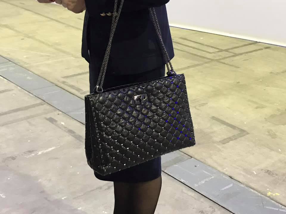 Ее заметили с шикарнейшей сумкой Valentino Rockstud в самом большом размере. Цена аксессуара на официальном сайте - $3295. Фото опубликовано на Facebook-странице журналиста Анны Стешенко. "Эту модель fashion-блогеры часто называют "сумка-мечта". Ещё бы. Для многих простых украинок это не то, что мечта. Это космос", - отметила Стешенко.