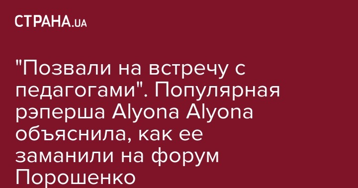 Популярная рэперша Alyona Alyona (Алена Савраненко) заявила, что случайно попала на форум БПП с Петром Порошенко, который пошел в президенты на второй срок. По ее словам, ее позвали на встречу с педагогами с благотворительными целями и она совсем не ожидала оказаться на политическом мероприятии. Об этом она написала в Facebook.