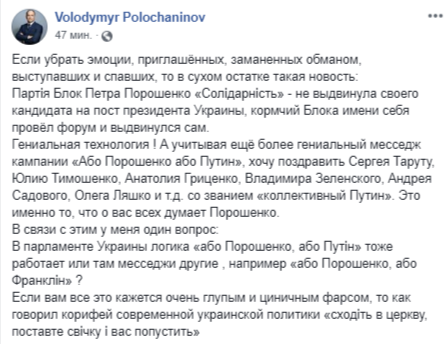 "Гениальная технология! А учитывая ещё более гениальный месседж кампании "Або Порошенко або Путин", хочу поздравить Сергея Таруту, Юлию Тимошенко, Анатолия Гриценко, Владимира Зеленского, Андрея Садового, Олега Ляшко и т.д. со званием "коллективный Путин". Это именно то, что о вас всех думает Порошенко" - написал пользователь.