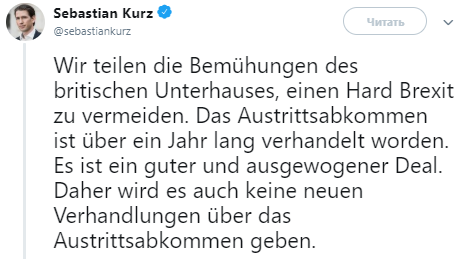 В свою очередь Курц на странице в Twitter подчеркнул, что разделяет усилия парламента Великобритании, направленные на то, чтобы не допустить "жесткого" Brexit, однако пересмотр соглашения невозможен - переговоры продолжались более года и привели к "хорошим и сбалансированным" условиям.