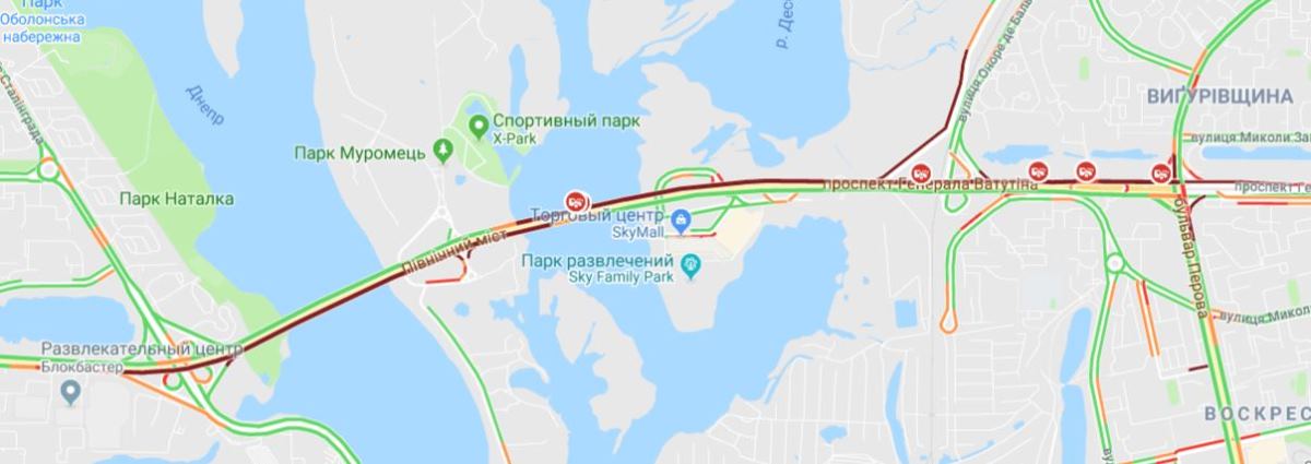 Авария произошла около 10:40, но по состоянию на 12:00 движение на самом Северном мосту, проспекте Бандеры и Ватутина все еще затруднено. Об этом говорят данные Google maps.