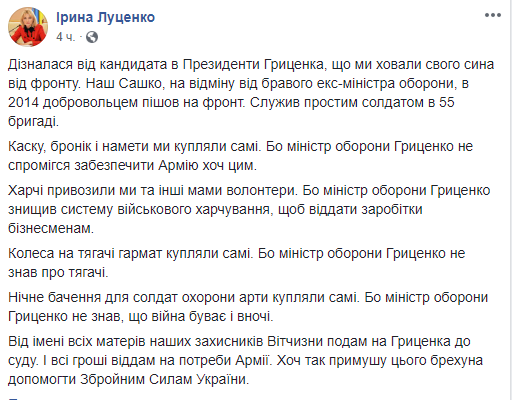 "Узнала от кандидата в президенты Гриценко, что мы прятали своего сына от фронта. Наш Саша, в отличие от бравого экс-министра обороны, в 2014 добровольцем ушел на фронт. Служил простым солдатом в 55 бригаде", - написала Ирина Луценко на странице в соцсети.